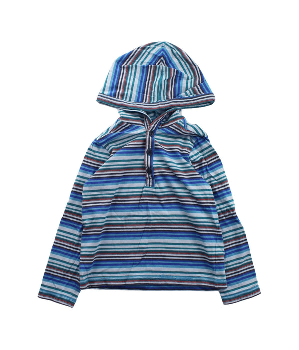 Keep your toddler stylishly cozy with this preloved Tea brand buttoned sweatshirt, featuring vibrant stripes and a practical hood, perfect for a 3-year-old boy embracing sustainable fashion.